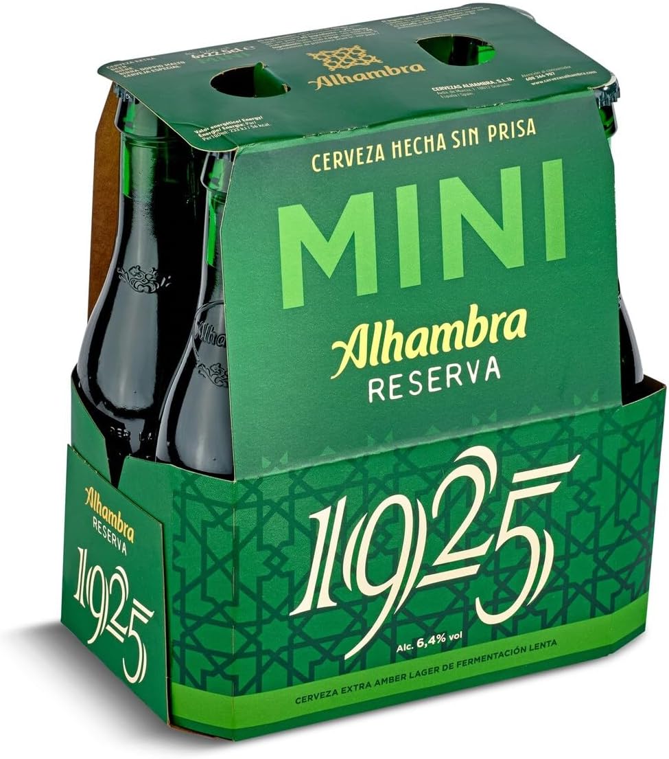Descripción del Producto El saber hacer de Cervezas Alhambra y el lúpulo Saaz de la más alta calidad se unen para presentar Alhambra Reserva 1925. Una cerveza estilo Czech Amber Lager con carácter intenso y mucho cuerpo. Su color personal, a medio camino entre el dorado y el ámbar, revela el carácter especial de Alhambra Reserva 1925. Pack de 6 botellas de 22 cl cada una de Alhambra Reserva 1925, Edición Especial, cerveza Pilsner de carácter intenso y cuerpo, con 6,4% de alcohol. Para un mayor disfrute se recomienda consumir entre 4º y 8º C. Ingredientes Agua, Malta de Cebada, Maíz, Lúpulo