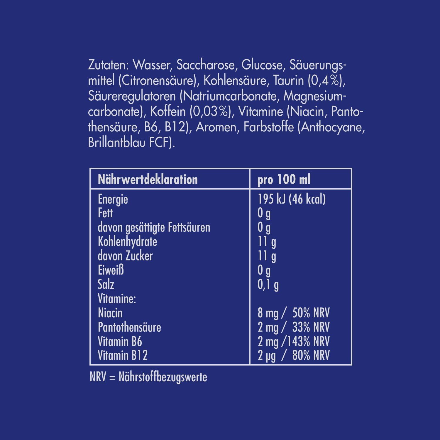 Red Bull Energy Drink Blue Edition incluye ingredientes vitamínicos de alta calidad: complejo de cafeína, taurina, vitamina B, sacarosa y glucosa, agua de Alpilles.