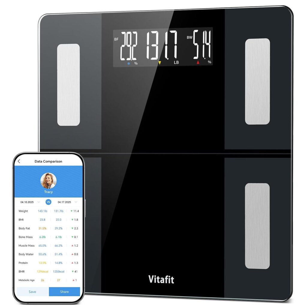 Pantalla LCD Todo en Uno: Al conectarla con la app Vitafit, nuestra báscula de grasa corporal mostrará 6 mediciones principales de composición corporal, incluyendo peso, IMC, grasa…