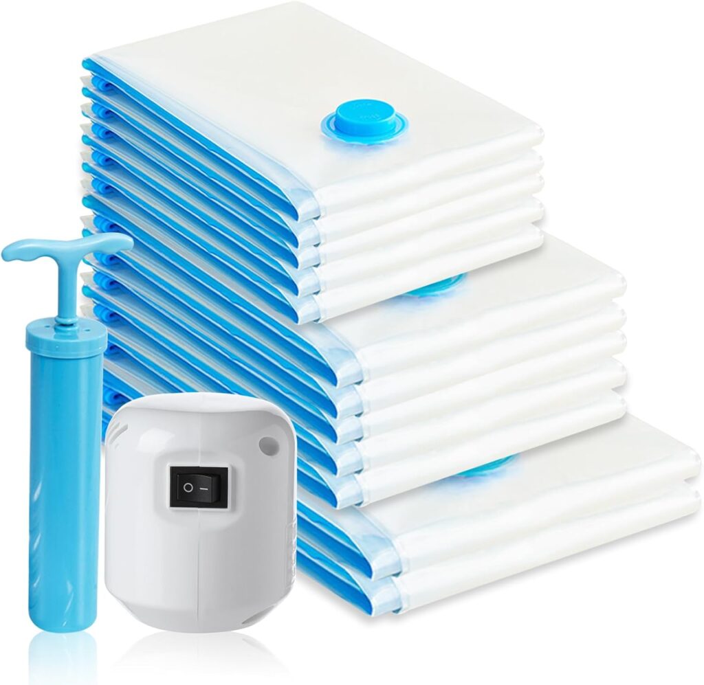 Tamaño y cantidad Recibirá 1 bomba de vacío manual azul, 1 bomba de vacío eléctrica blanca, 12 bolsas de almacenamiento al vacío en 3 tamaños diferentes. 5 medianas (60 x 80 cm), 5…