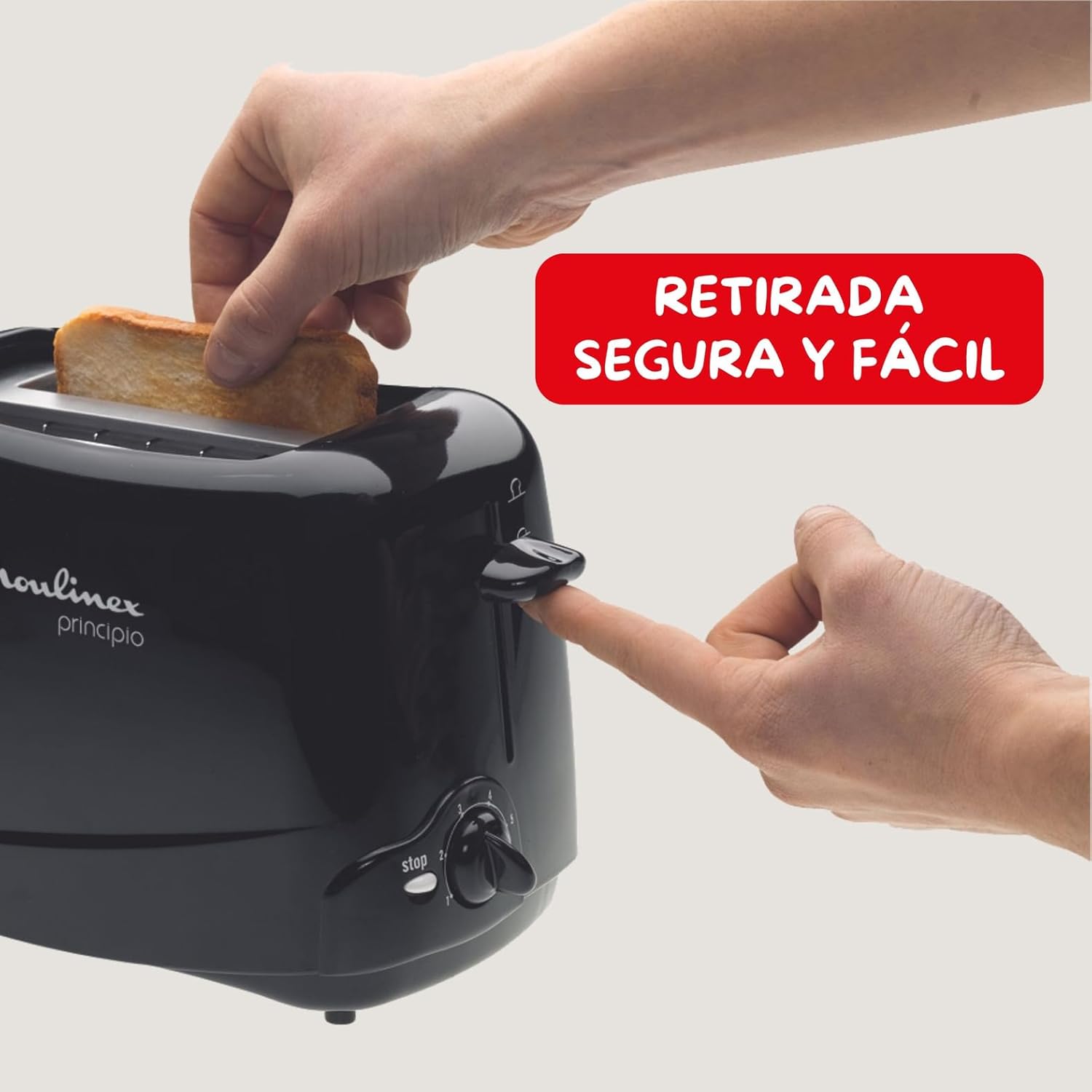 La forma más fácil de disfrutar de unas tostadas doradas en el desayuno. ¡Descubre la Tostadora de Ranura Moulinex Principio 2! No hay riesgo de quemarte los dedos gracias a su función de elevación que eleva el pan para que puedas sacarlo fácilmente. Limpia tu tostadora sin tener que inclinarla gracias a la bandeja recogemigas. Disfruta de unas tostadas doradas para desayunar.