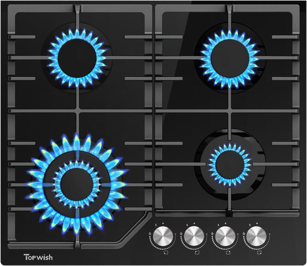 4 Fuegos quemadoresEsta placa de gas es con 4 potentes quemadores1 x 3500W Quemador wok de doble anillo, 2 x 1750W Quemador semi rápido, 1 1000W Quemador auxiliar. 4 mando giratorio