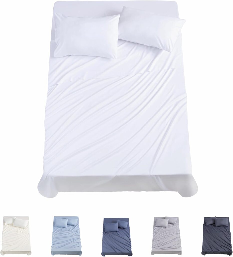 El juego de sábanas de cama de 4 piezas, incluye 1 sábana encimera, 1 sábana bajera ajustable y 2 fundas de almohada de 50×80 cm con cierre envolvente de solapa. El tejido es de calidad