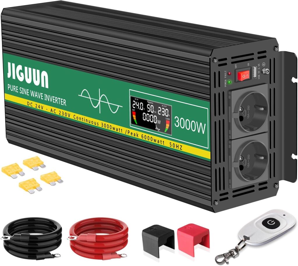 3000W Inversor Onda PuraPotente potencia pico de 6000W, salida continua de 3000W de onda sinusoidal pura. Puede convertir 24V DC de entrada a 220V230V de onda sinusoidal pura igual que