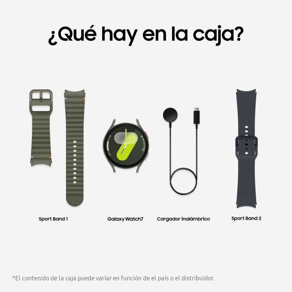 ¿Qué hay en la caja? : 1x SAMSUNG Galaxy Watch7 Bluetooth en verde, cargador (Micro USB), manual de usuario y correa adicional