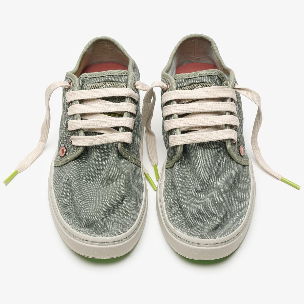 Zapatillas ecológicas unisex Modelo con cordones dobles en algodón y PET reciclado Parte superior de algodón reciclado Forro interior de algodón Plantilla ergonómica extraíble (equipada con una segunda plantilla fina de EVA para insertar debajo de la ergonómica en caso de que el zapato fuera un poco grande) Suela de caucho reciclado de otras suelas satorisan, antideslizante y cosida Hecho a mano en Vietnam Lavable a máquina en frío (máx. 24°) Sin cordones o plantilla. No secar en secadora ni al sol directo. 100% vegano. Este calzado no contiene componentes animales en la pala, forro interior, ni en los tratamientos y acabados. Libre de animales