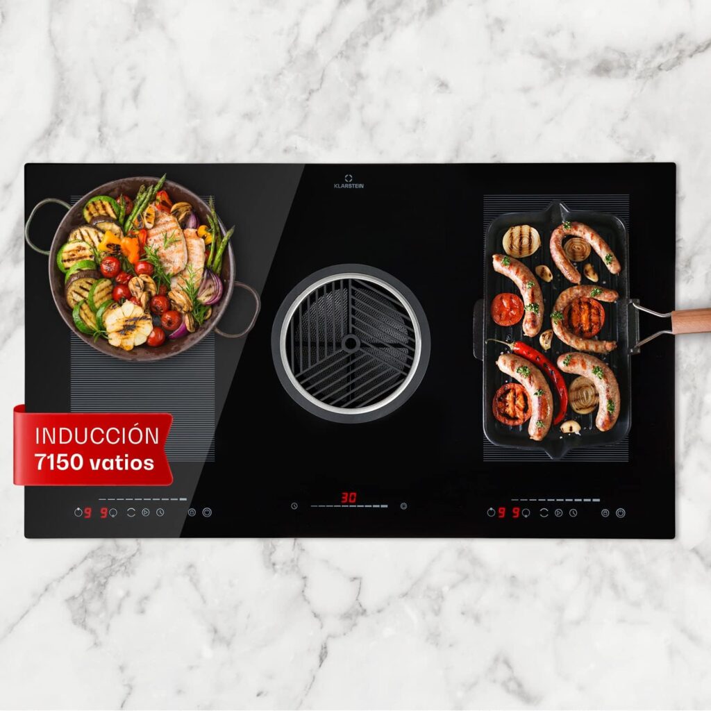 UNA COMBINACIÓN FUNCIONAL Esta placa de inducción eléctrica y extractor de cocina 2 en 1 se puede integrar en un banco de cocina. Elimina rápidamente los olores y los humos a la vez que